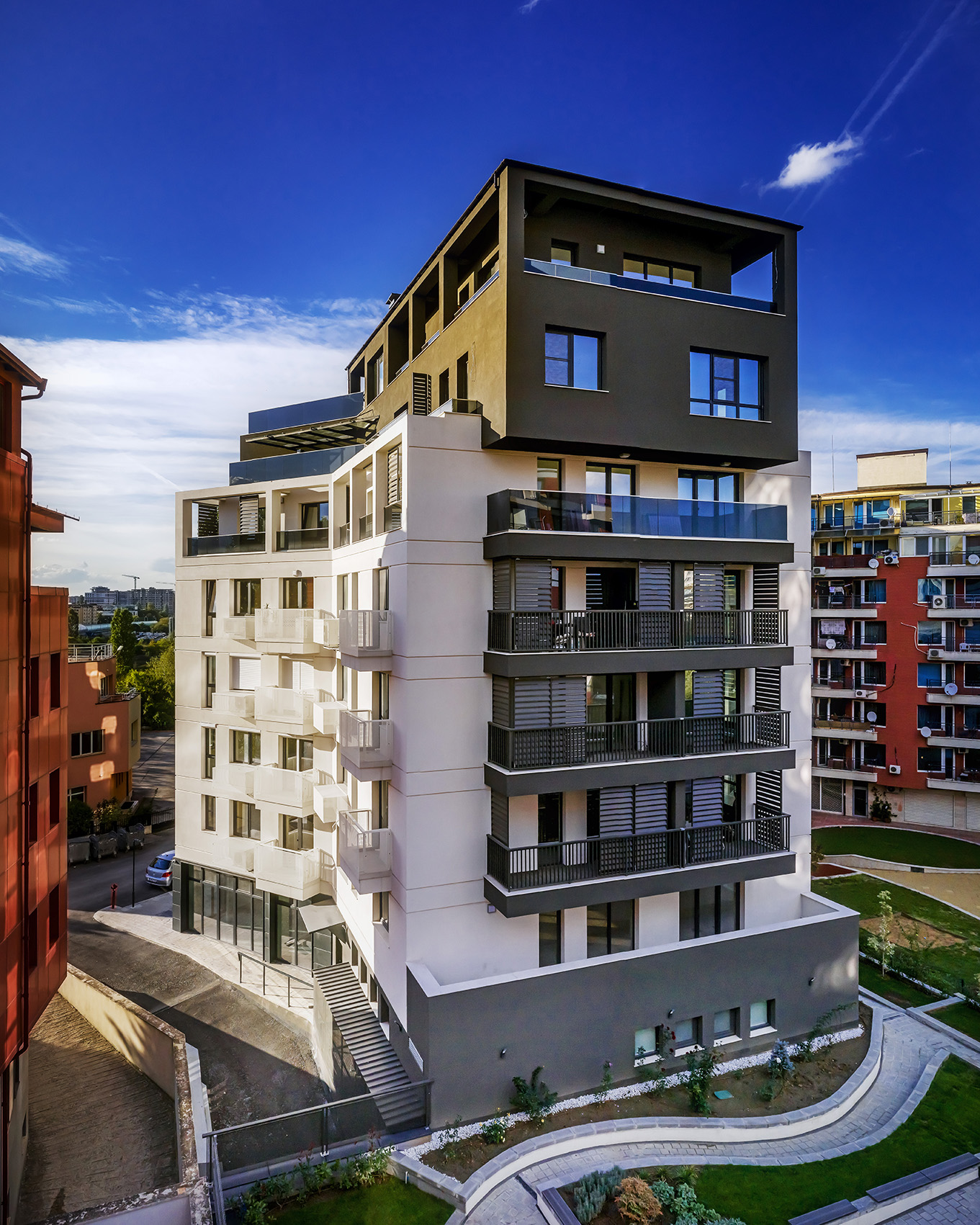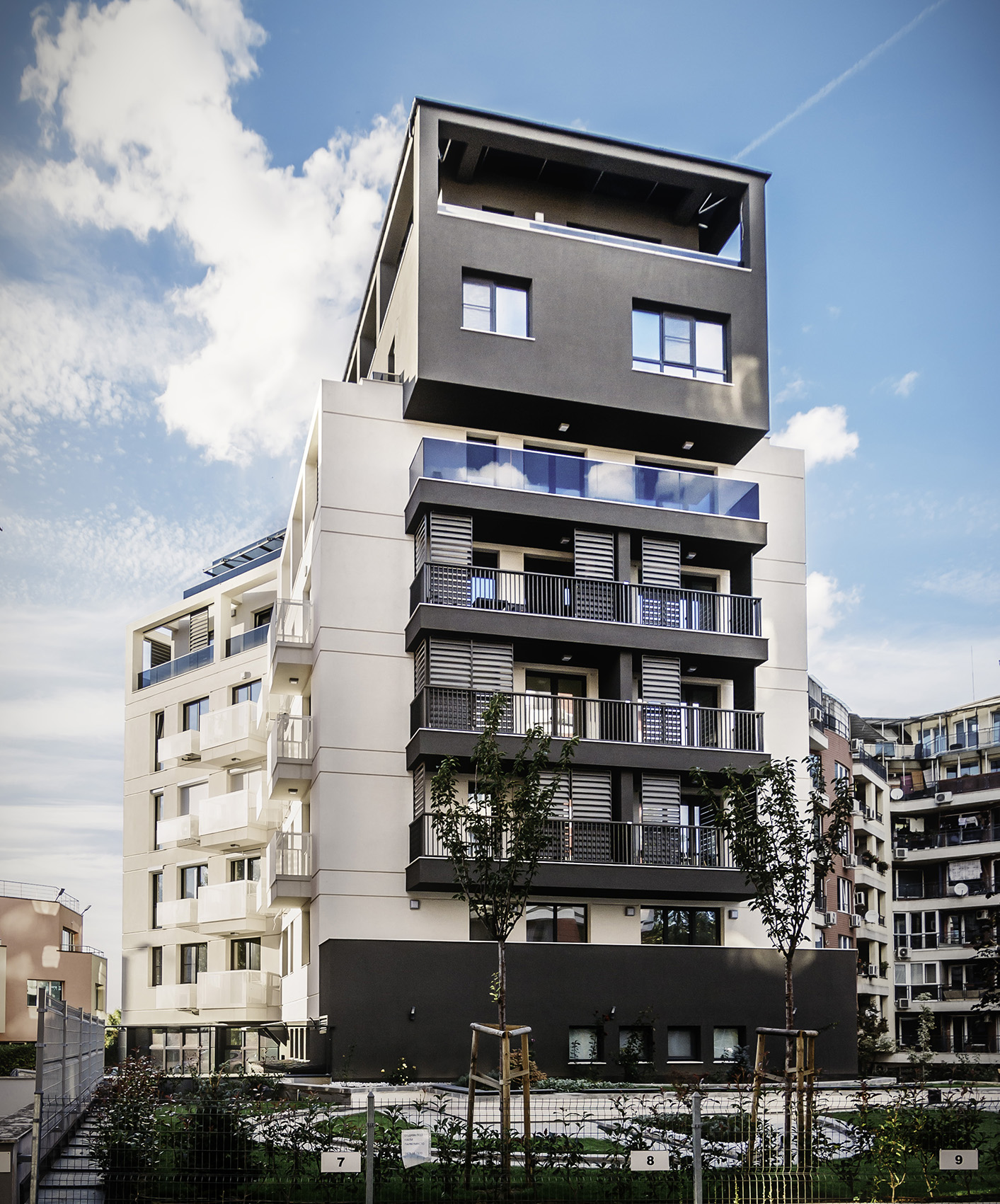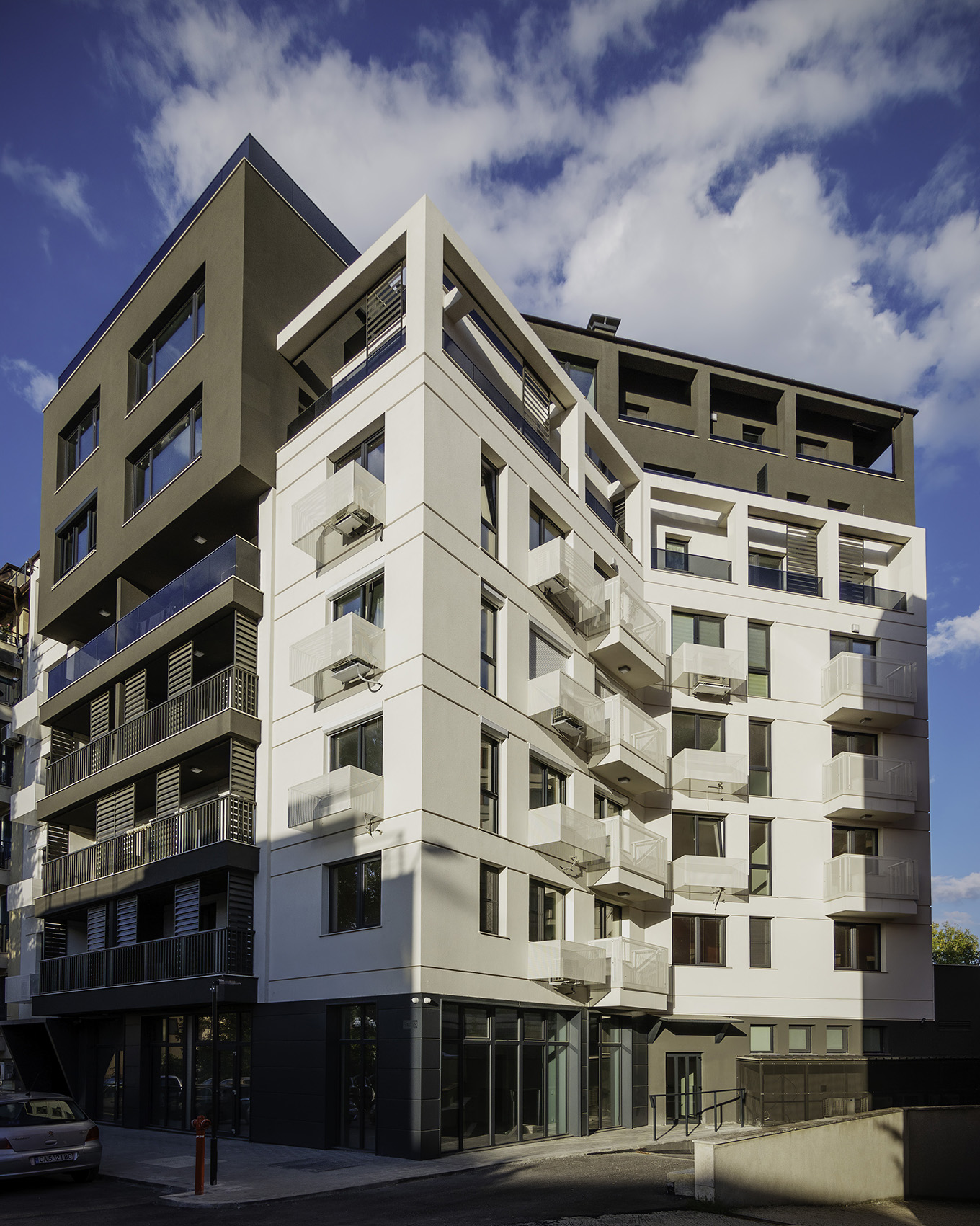 Сградата е разположена в динамично развиваща се градска среда - относителната близост с централните територии, наличието на метростанция и основни транспортни артерии, добре развитата инфраструктура в района, както и терените, отредени за паркова среда, обуславят привлекателността на местоположението й. В сградата са разположени 21 апартамента, а за постигане на необходимия брой паркоместа за обектите (апартаменти, многофункционална зала и офис) са използвани 4 броя хидравлични паркинг системи, с което се осигуряват общо 26 паркоместа. Към всеки апартамент е предвидена тераса, със слънцезащитни елементи по архитектурен детайл. Върху последните покривни плочи са разположени соларни панели, които осигуряват захранването с топла битова вода за апартаментите разположени на шести и седми жилищни етажи.