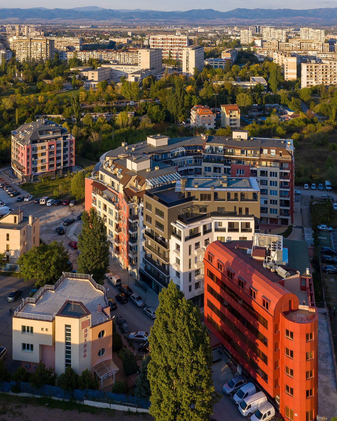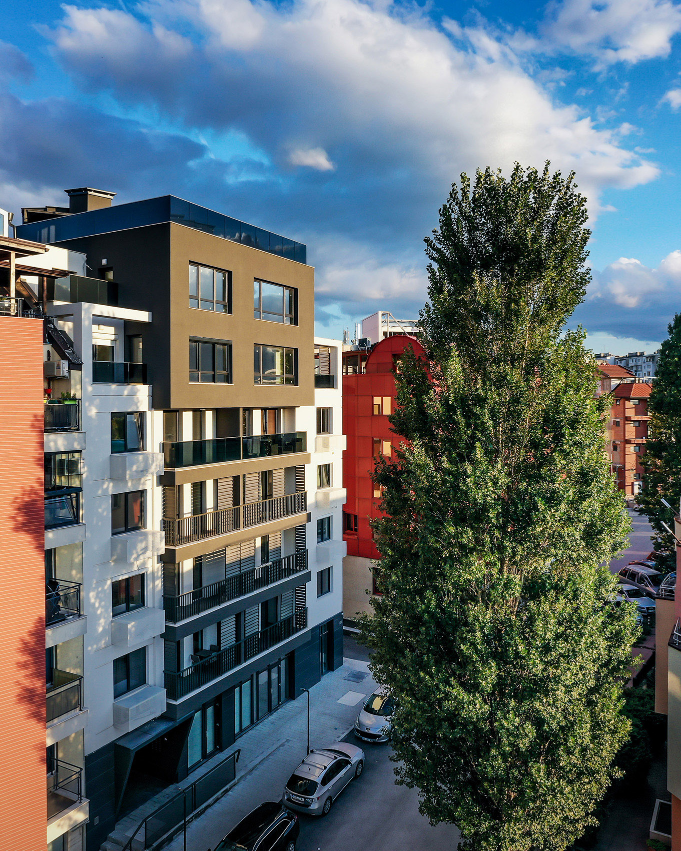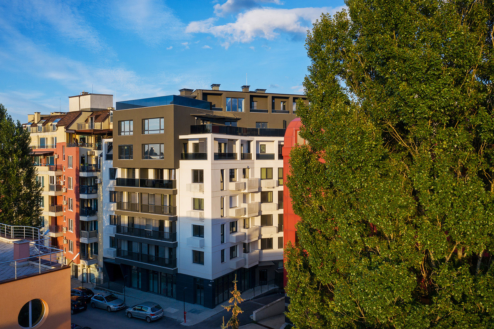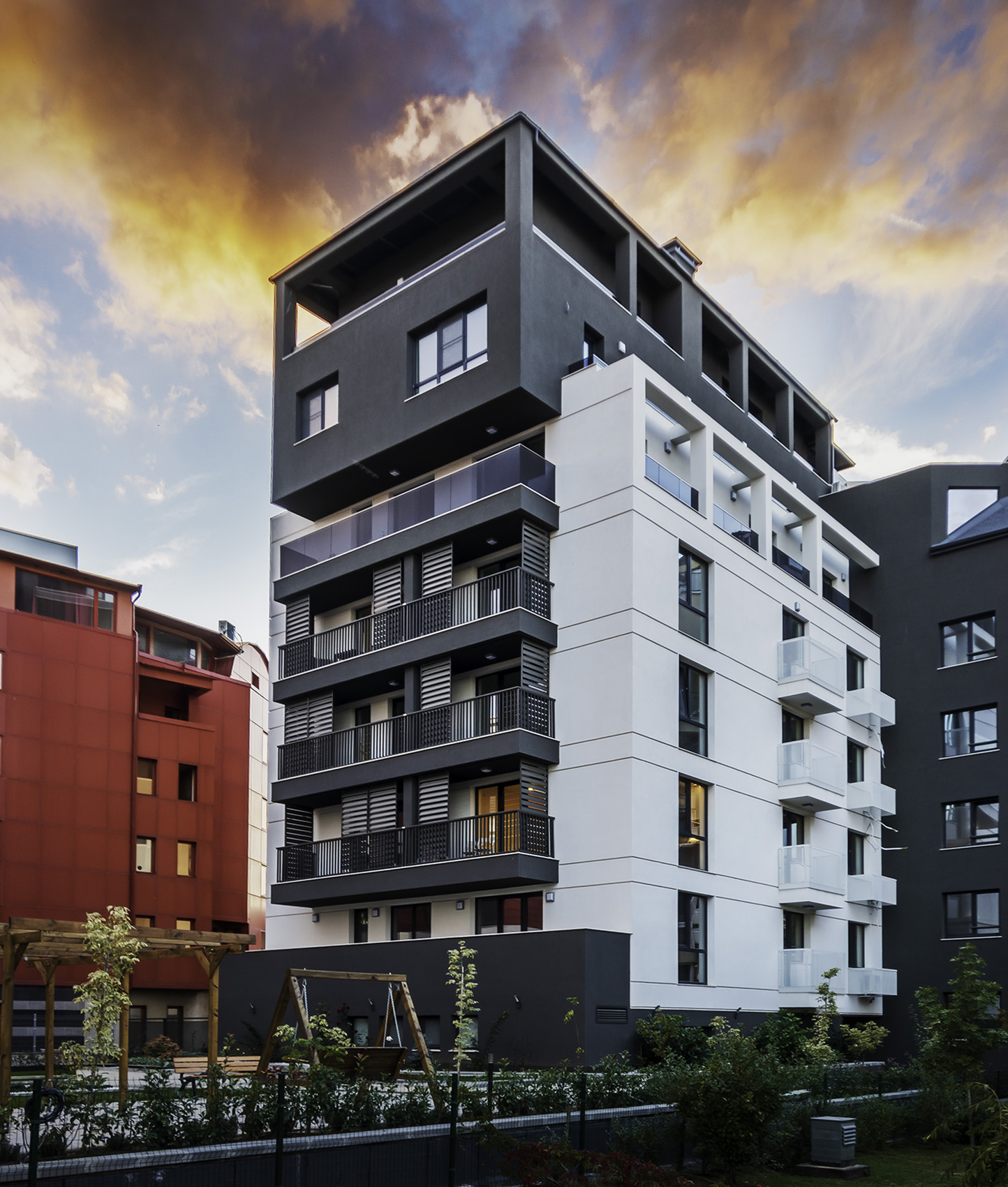 Сградата е разположена в динамично развиваща се градска среда - относителната близост с централните територии, наличието на метростанция и основни транспортни артерии, добре развитата инфраструктура в района, както и терените, отредени за паркова среда, обуславят привлекателността на местоположението й. В сградата са разположени 21 апартамента, а за постигане на необходимия брой паркоместа за обектите (апартаменти, многофункционална зала и офис) са използвани 4 броя хидравлични паркинг системи, с което се осигуряват общо 26 паркоместа. Към всеки апартамент е предвидена тераса, със слънцезащитни елементи по архитектурен детайл. Върху последните покривни плочи са разположени соларни панели, които осигуряват захранването с топла битова вода за апартаментите разположени на шести и седми жилищни етажи.
