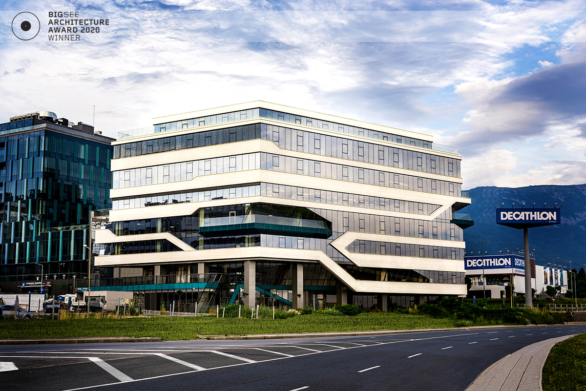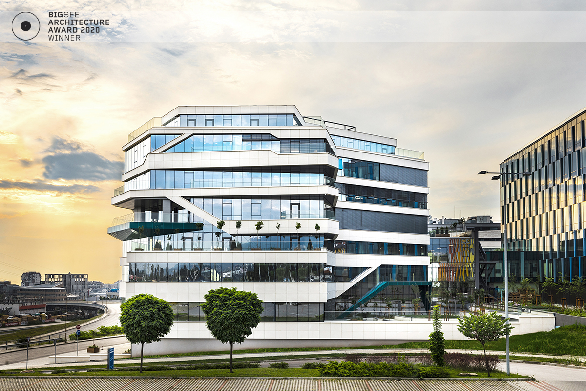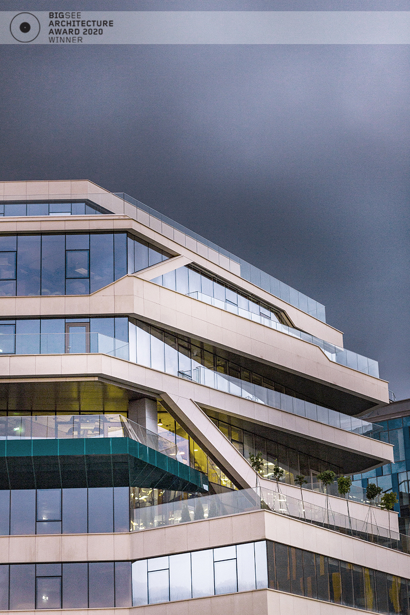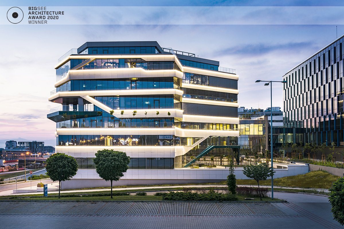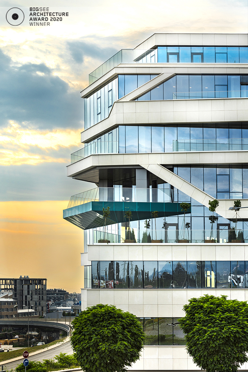 The building north facade is detached from the terrain via passage, which is foreseen to be covered sidewalk in front of the shops. The exterior goes lightly in the interior via the main entrance. Inside, a floating staircase makes the connection between the main entrance and the park on the next level. All the materials and building installations are high class. For the facade is used natural stone, and top quality triple facade glazing system with high level sound insulation. The HVAC system is made of the highest level daikin devices. The entire east, south and west facades are covered with external blinds, providing high quality comfort during the hot days. As a design order from the Owner, the building is designed and constructed with first class materials and installations. The building expects LEED certification in December 2019.