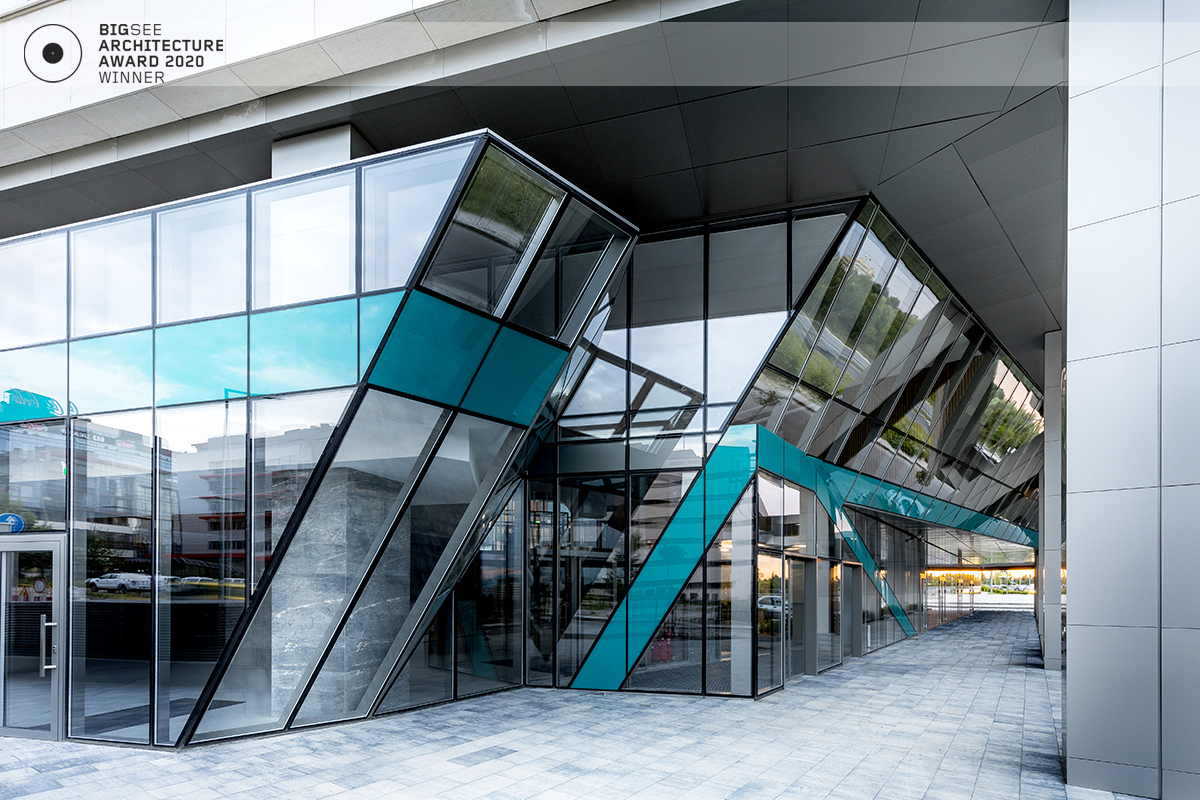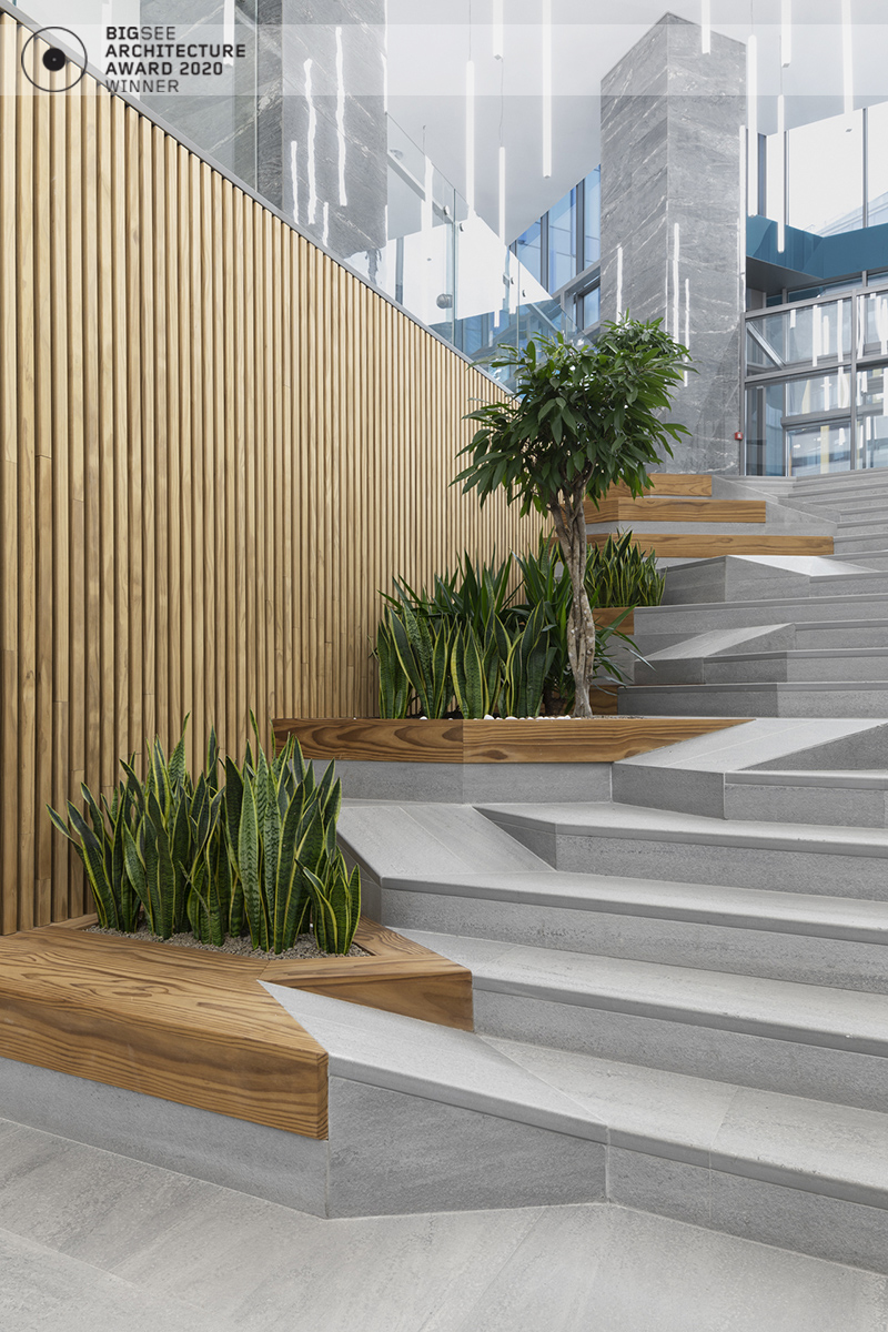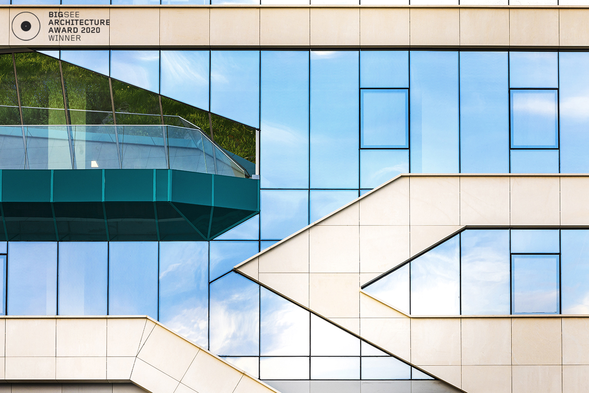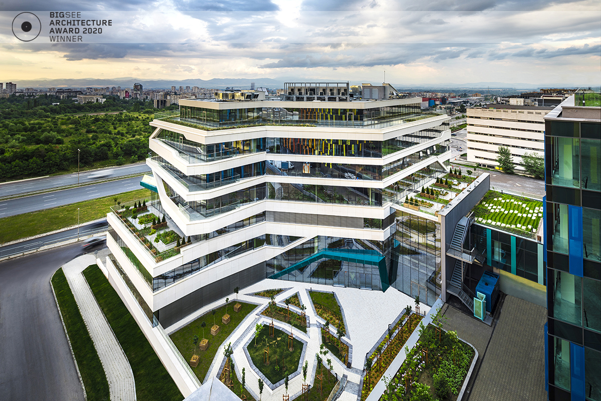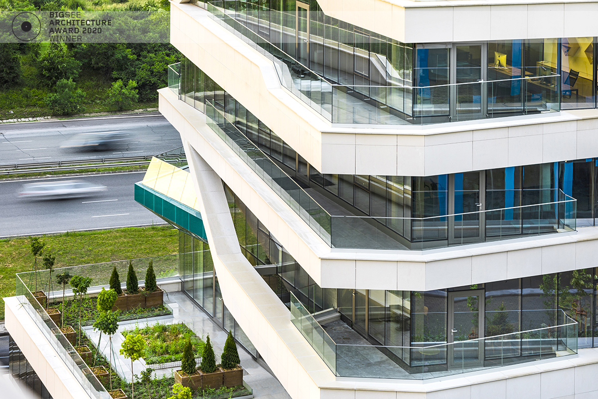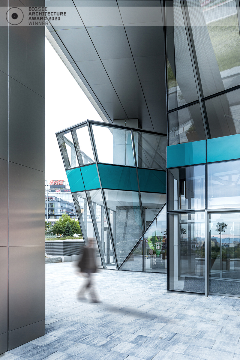 The building north facade is detached from the terrain via passage, which is foreseen to be covered sidewalk in front of the shops. The exterior goes lightly in the interior via the main entrance. Inside, a floating staircase makes the connection between the main entrance and the park on the next level. All the materials and building installations are high class. For the facade is used natural stone, and top quality triple facade glazing system with high level sound insulation. The HVAC system is made of the highest level daikin devices. The entire east, south and west facades are covered with external blinds, providing high quality comfort during the hot days. As a design order from the Owner, the building is designed and constructed with first class materials and installations. The building expects LEED certification in December 2019.