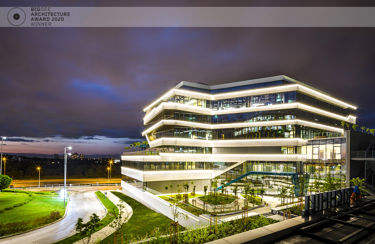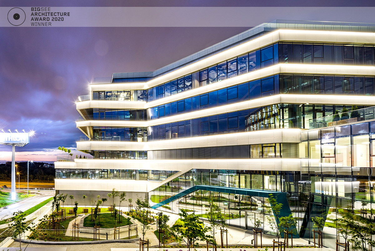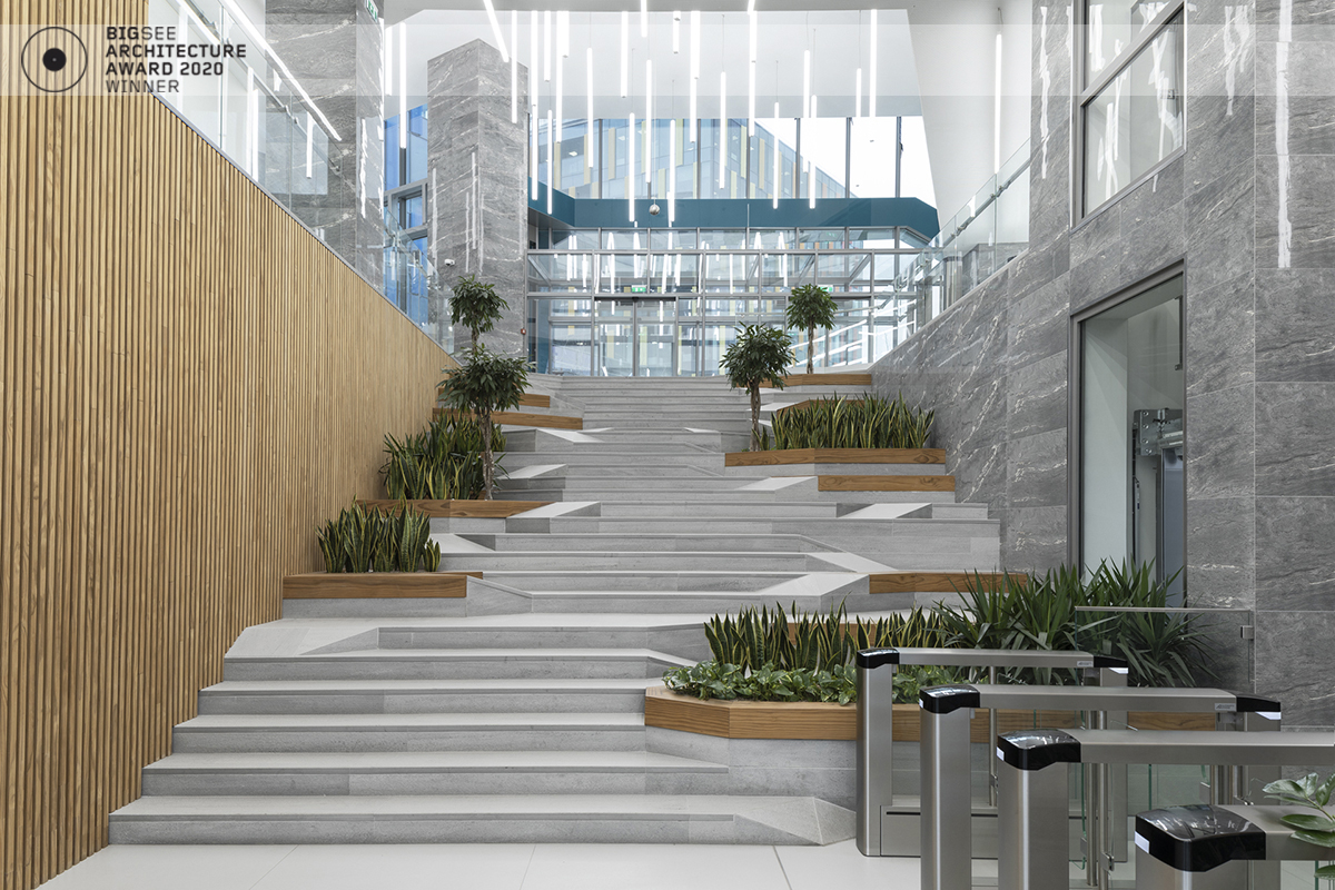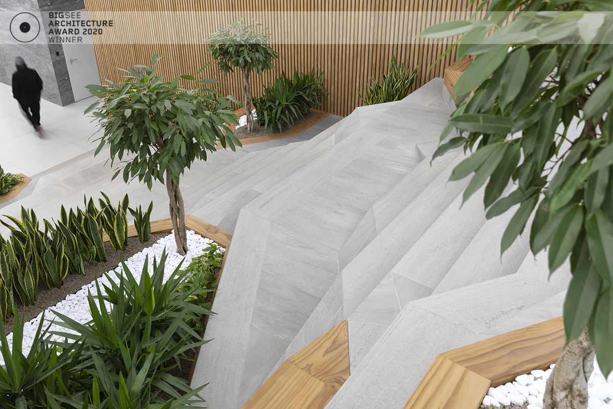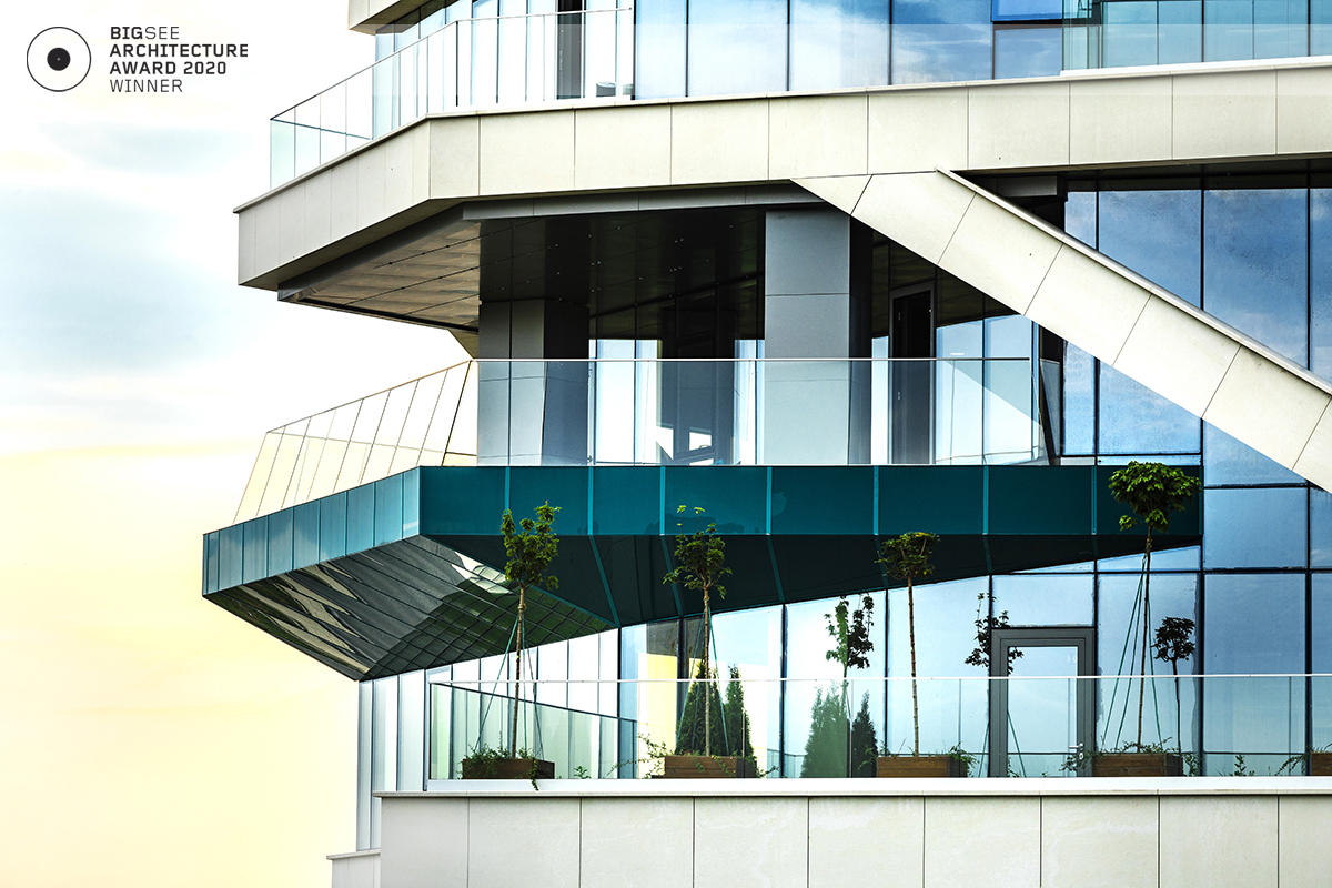 The building north facade is detached from the terrain via passage, which is foreseen to be covered sidewalk in front of the shops. The exterior goes lightly in the interior via the main entrance. Inside, a floating staircase makes the connection between the main entrance and the park on the next level. All the materials and building installations are high class. For the facade is used natural stone, and top quality triple facade glazing system with high level sound insulation. The HVAC system is made of the highest level daikin devices. The entire east, south and west facades are covered with external blinds, providing high quality comfort during the hot days. As a design order from the Owner, the building is designed and constructed with first class materials and installations. The building expects LEED certification in December 2019.