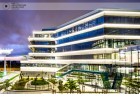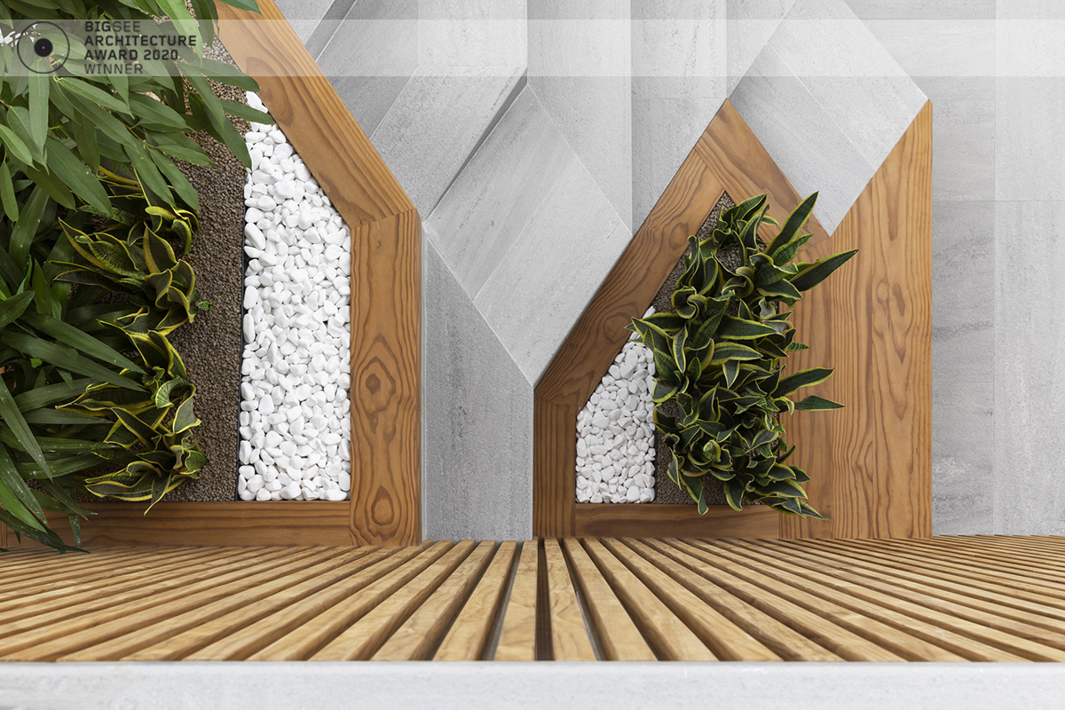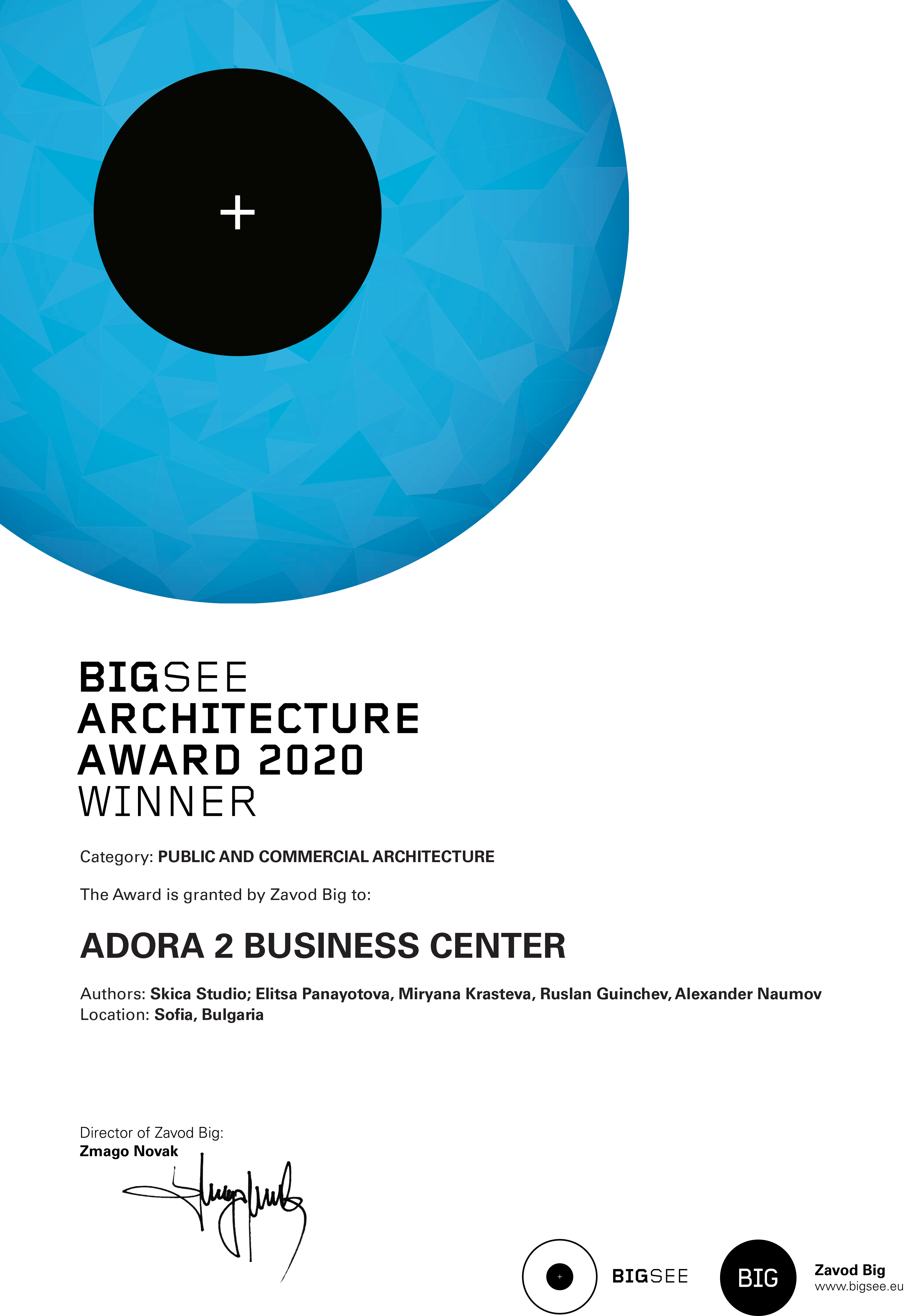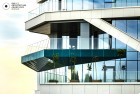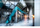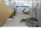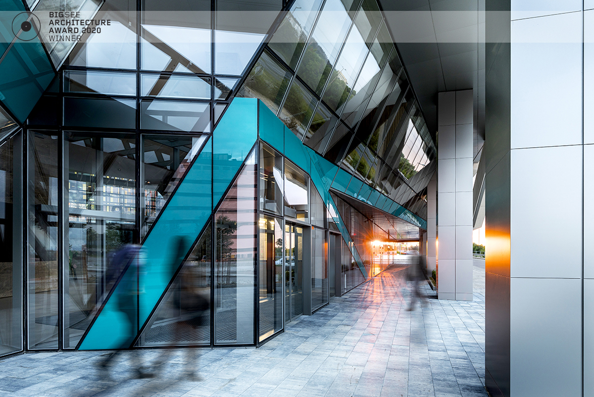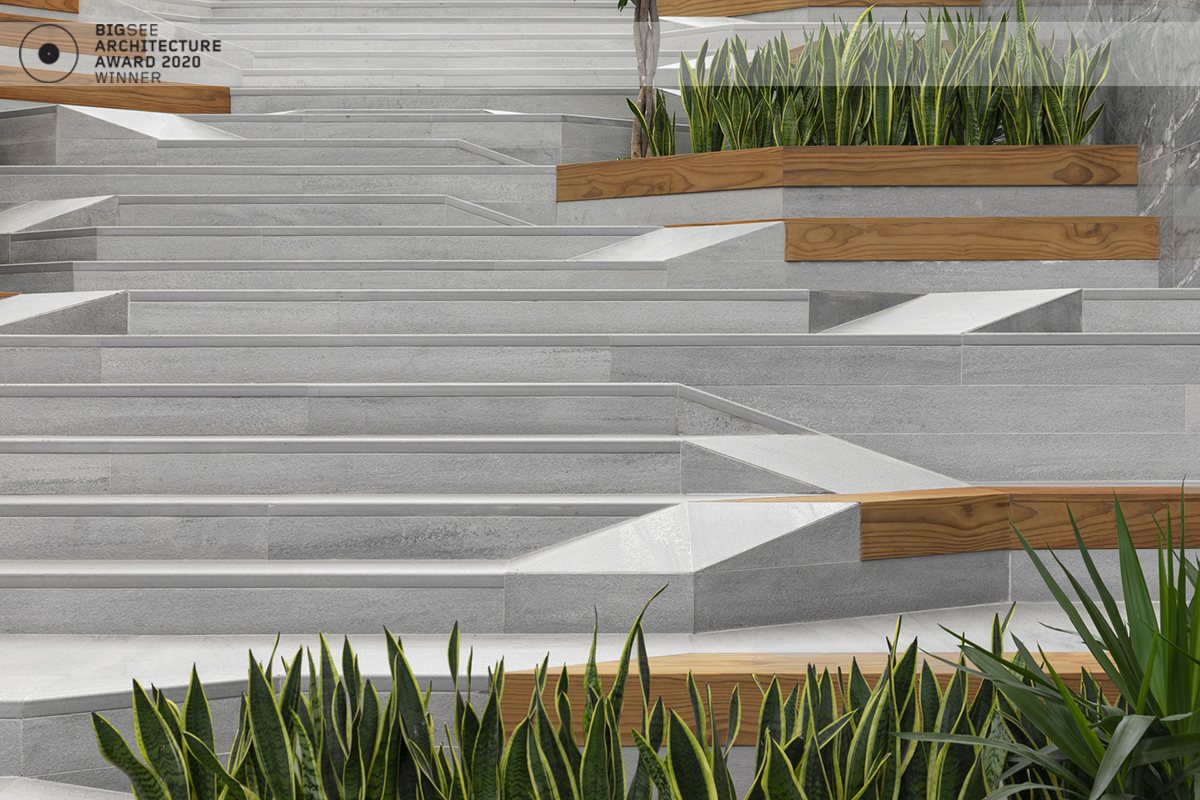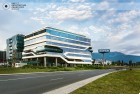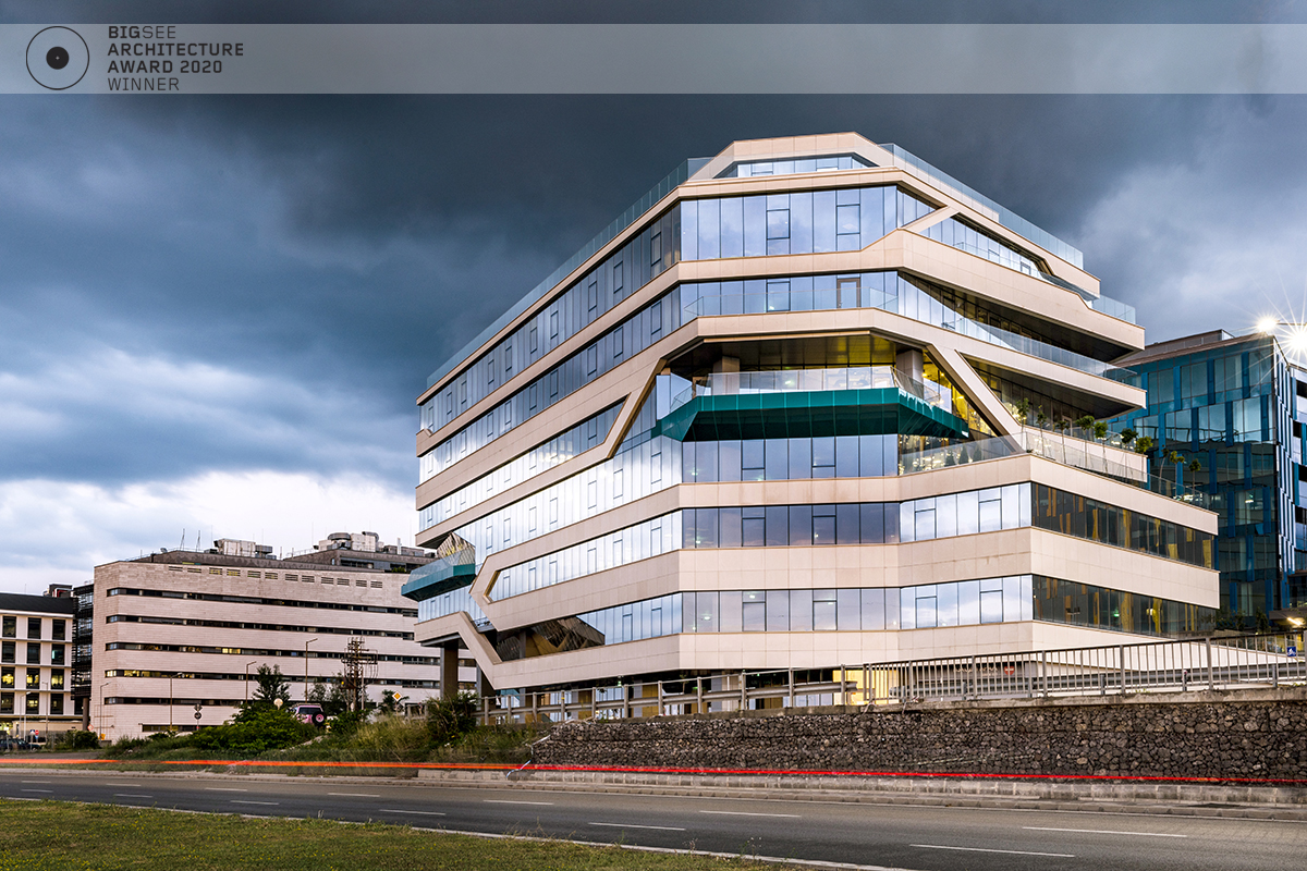The building north facade is detached from the terrain via passage, which is foreseen to be covered sidewalk in front of the shops. The exterior goes lightly in the interior via the main entrance. Inside, a floating staircase makes the connection between the main entrance and the park on the next level. All the materials and building installations are high class. For the facade is used natural stone, and top quality triple facade glazing system with high level sound insulation. The HVAC system is made of the highest level daikin devices. The entire east, south and west facades are covered with external blinds, providing high quality comfort during the hot days. As a design order from the Owner, the building is designed and constructed with first class materials and installations. The building expects LEED certification in December 2019.
