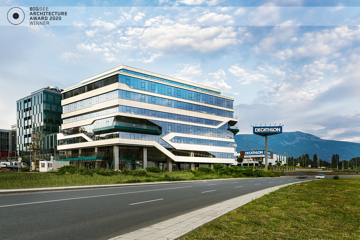 The main challenge in creating the architecture of the building was, that it would appeared in a very rapidly growing area, in which was unpredictable how it will look like “the day after”. This was the main reason the building to respect the pure place itself with the nature of the terrain. Located on a high speed boulevard – Sofia south ring road, the plot goes up with one storey level difference from north to south, from the ring road to the neighborhood. The plot is right next to the already built at that time Decathlon store.