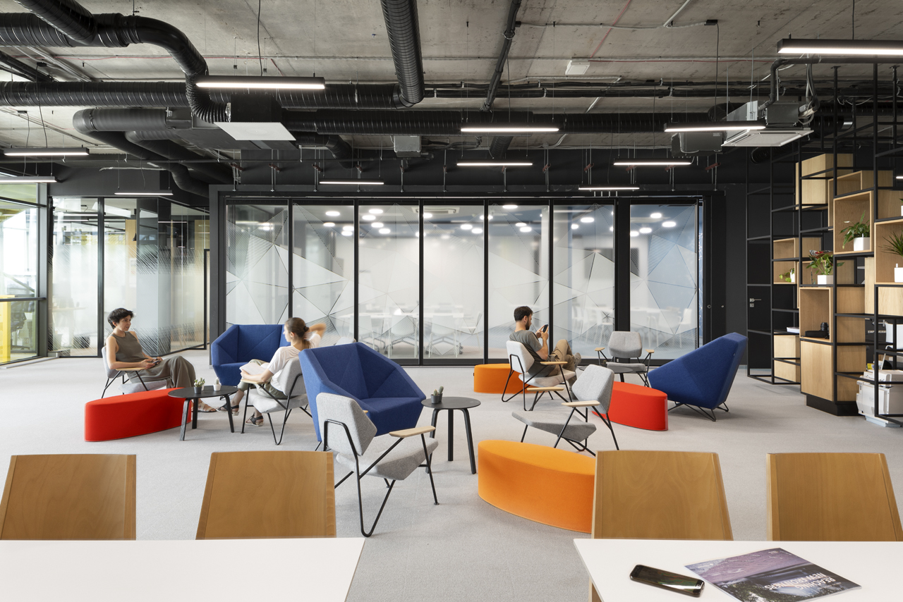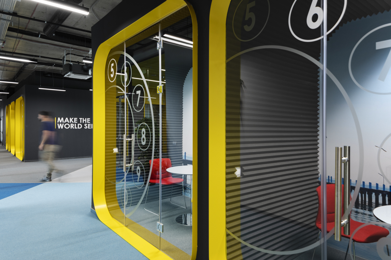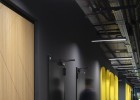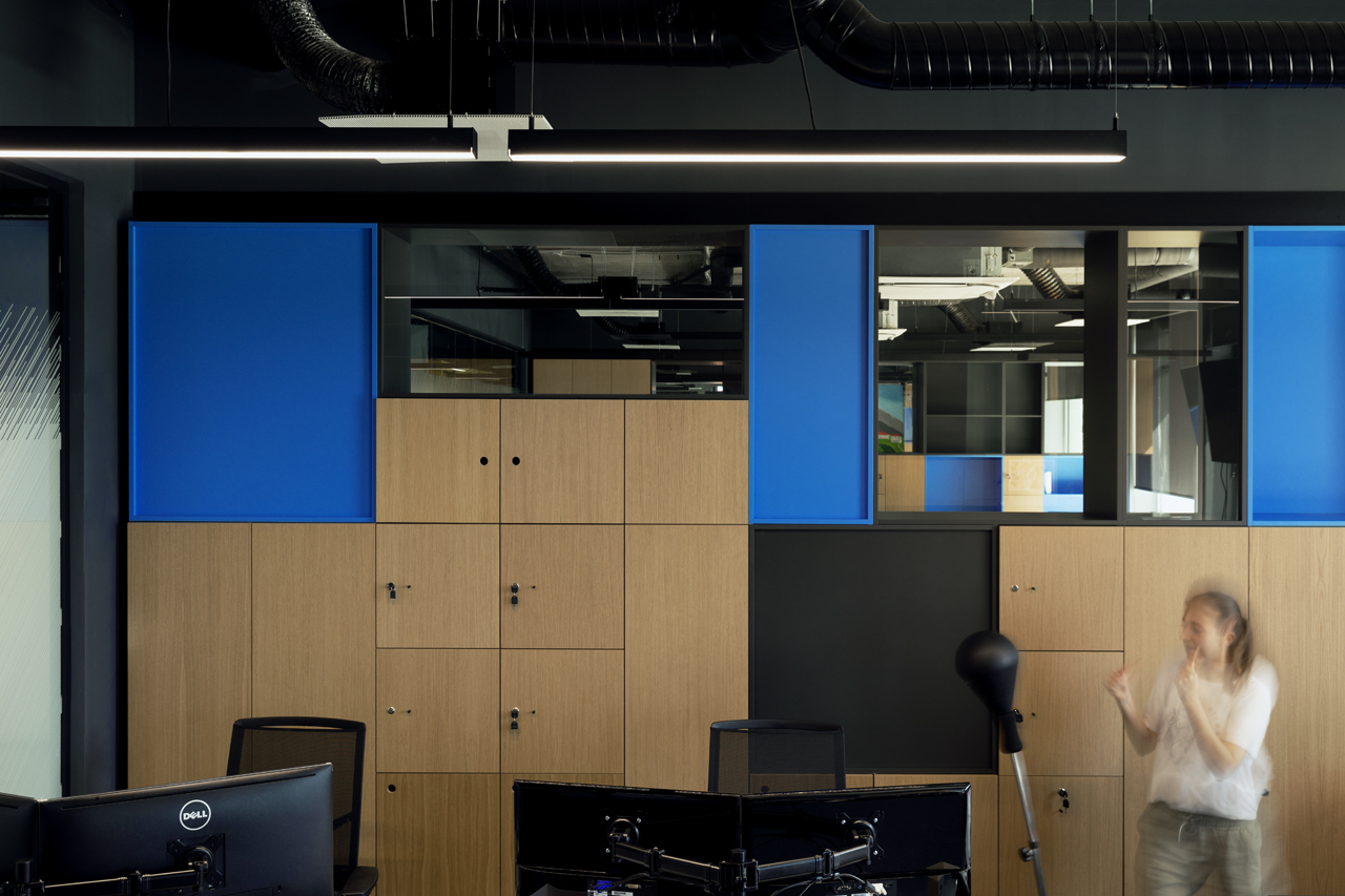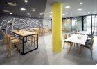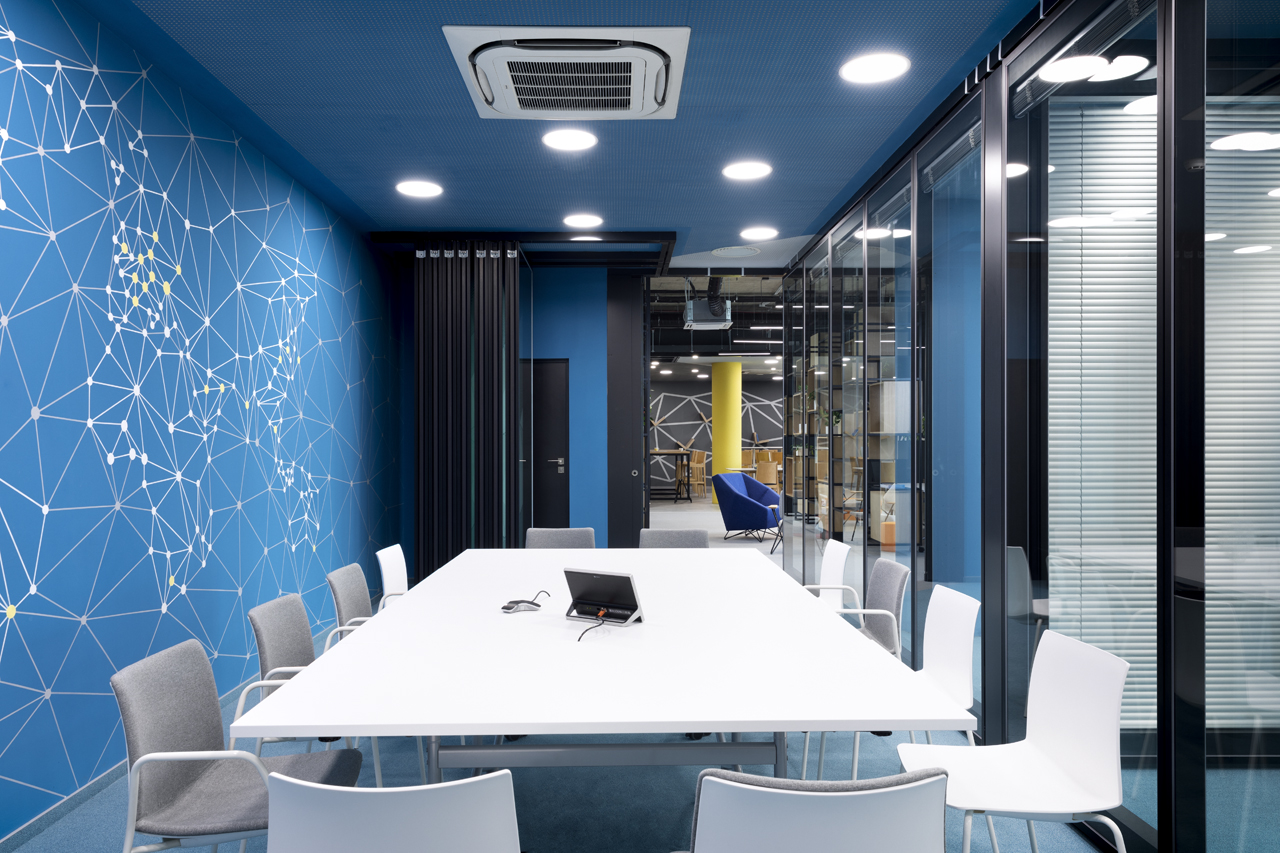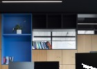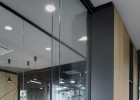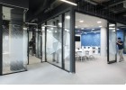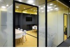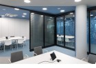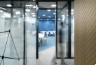 As a visitor, when you enter the Milestone office, you are welcomed at the reception and guided into the bright lounge area. To the left you can find the cafeteria and to the right – the conference rooms, both separated with retractable glass partitions that, if needed, can be hidden into the furniture walls, thus creating a large party/cocktail/event area. Next to the entrance are located the eight phone booths that can accommodated up to 4 people each – with sound-absorbing walls and ceiling and a themed poster-print on the back wall. Across the hall are the management offices – open to welcome a business meeting or a team discussion. Next are the employee-only and restricted areas which offer spacious open-plan working areas and divided by see-through furniture walls with incorporated abundant storage space.