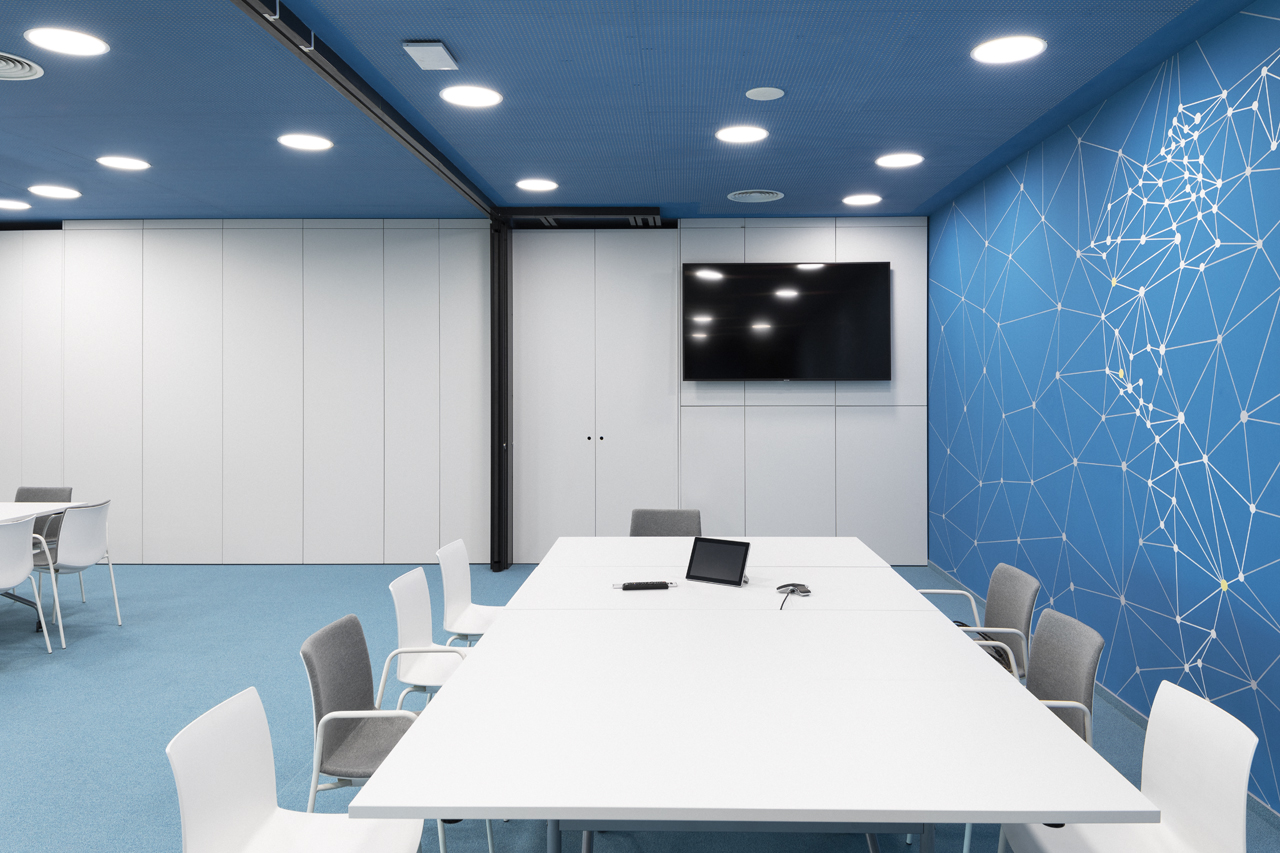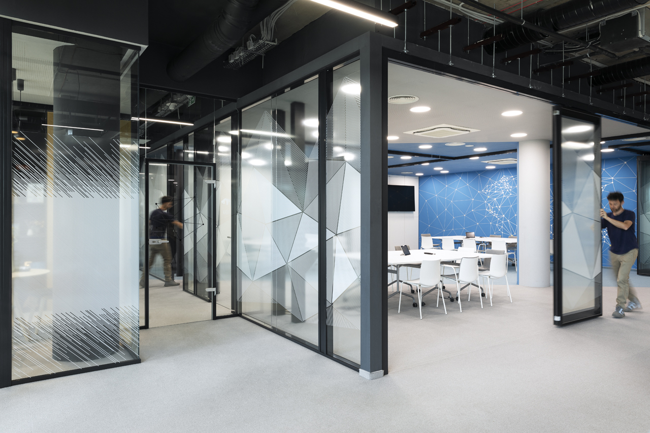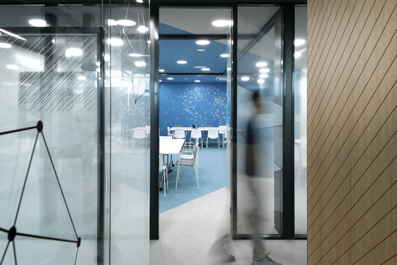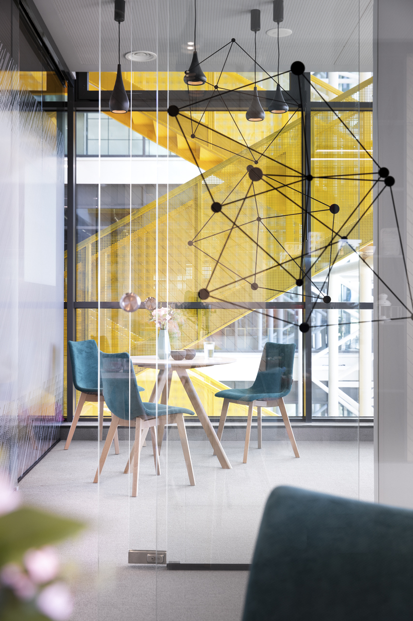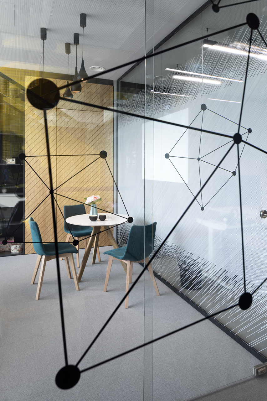 The coffee corners and small kitchen areas are spread throughout the office, as well as the more private meeting rooms. The graphic design is also done by SKICA. It uses the corporate colours and serves also as a delicate visual barrier between the different spaces – at times completely transparent or frosted to offer privacy, but always keeping the views to the Mountain and the city open.
