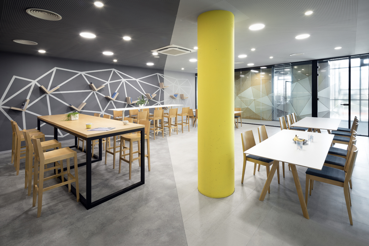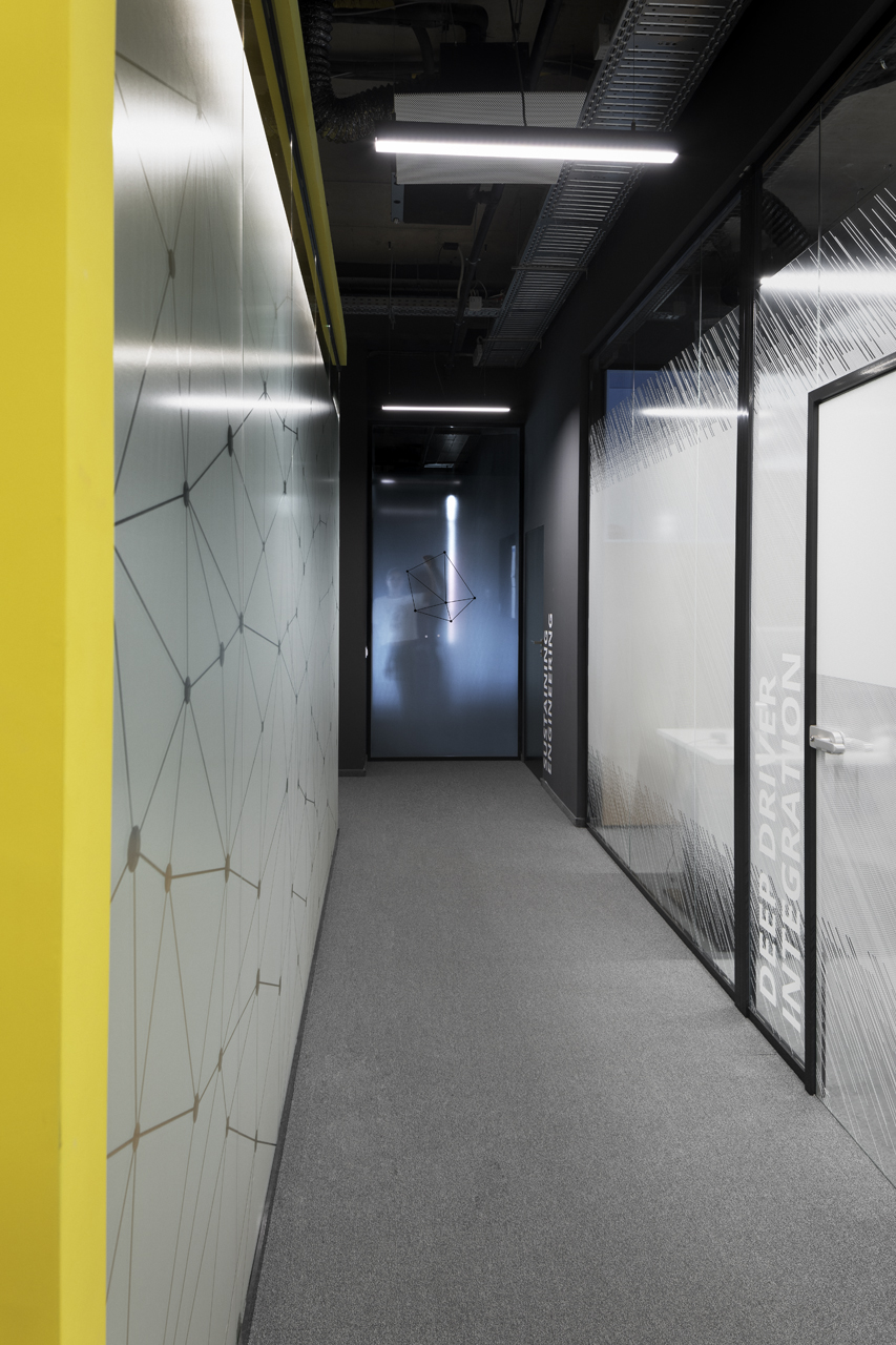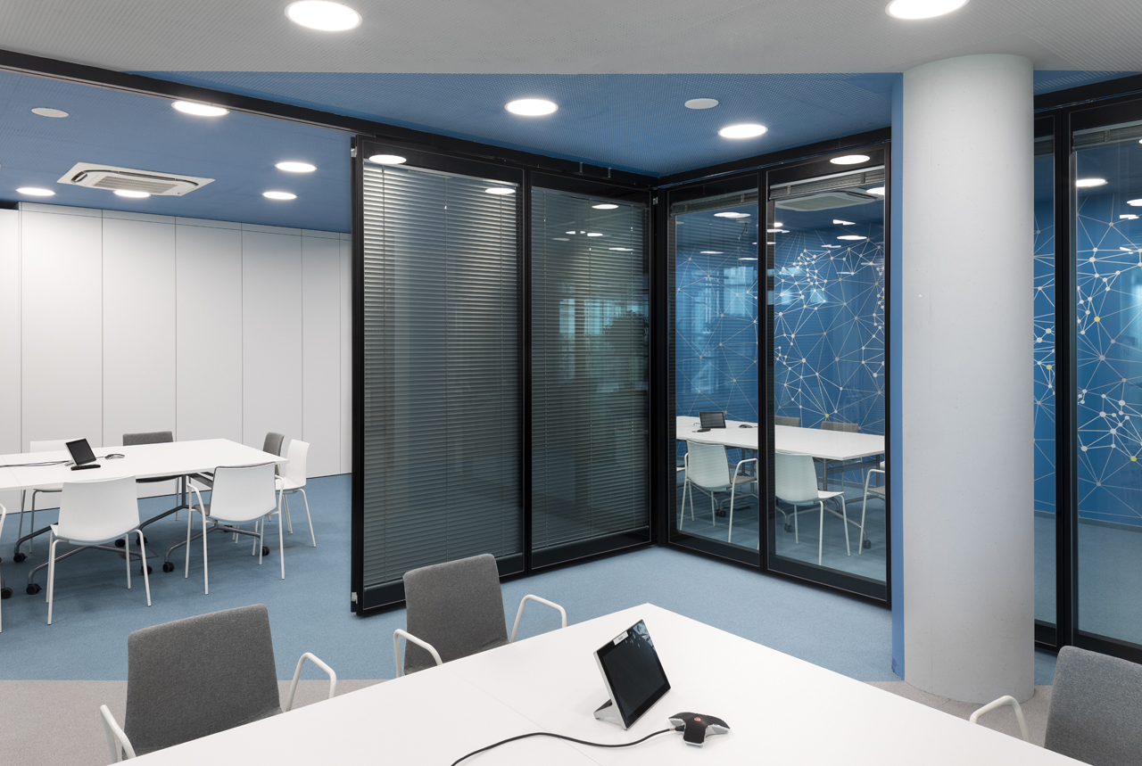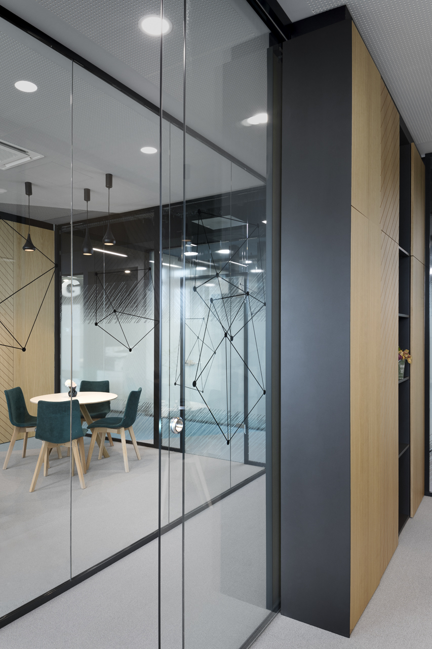 The coffee corners and small kitchen areas are spread throughout the office, as well as the more private meeting rooms. The graphic design is also done by SKICA. It uses the corporate colours and serves also as a delicate visual barrier between the different spaces – at times completely transparent or frosted to offer privacy, but always keeping the views to the Mountain and the city open.