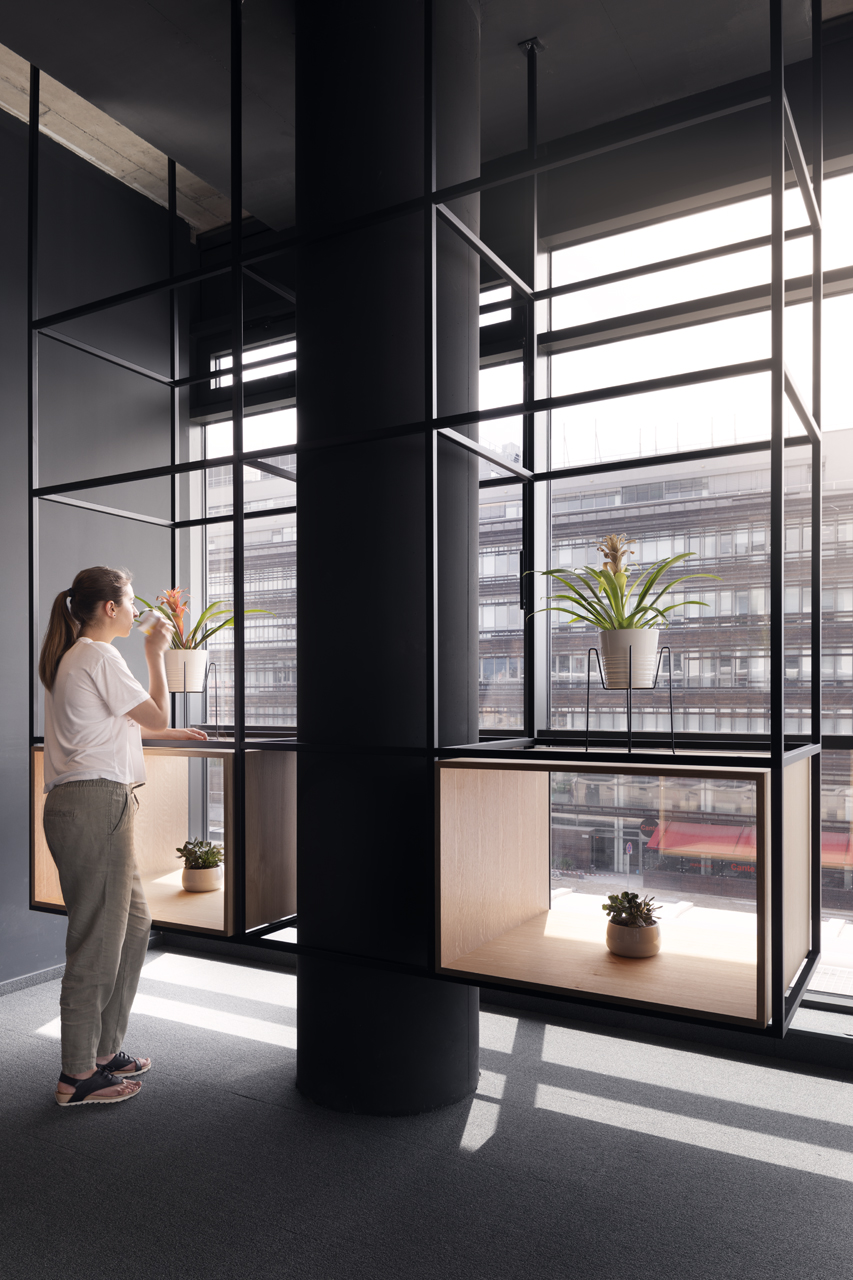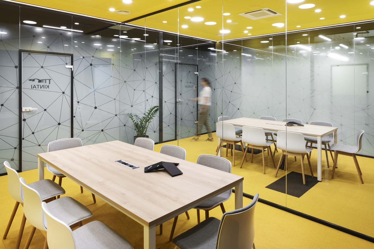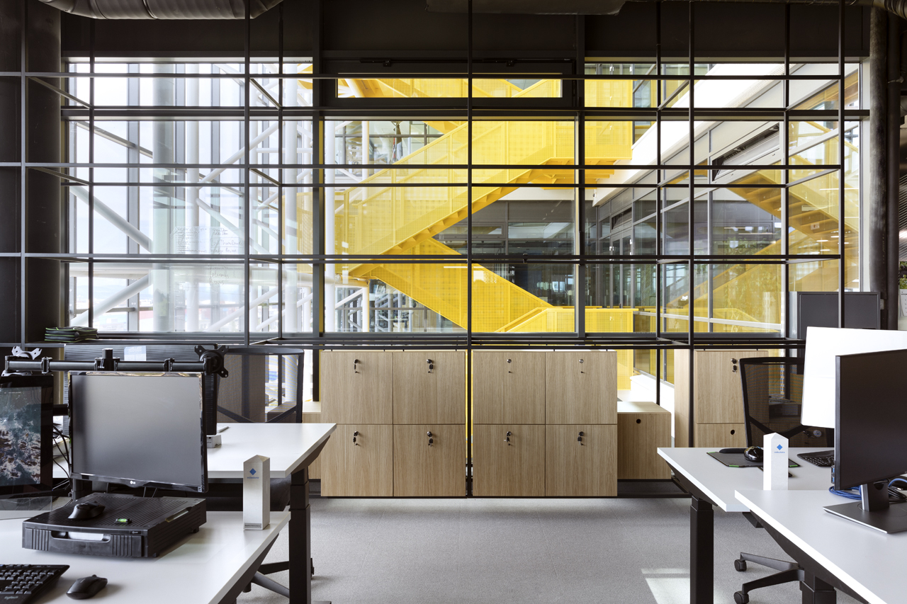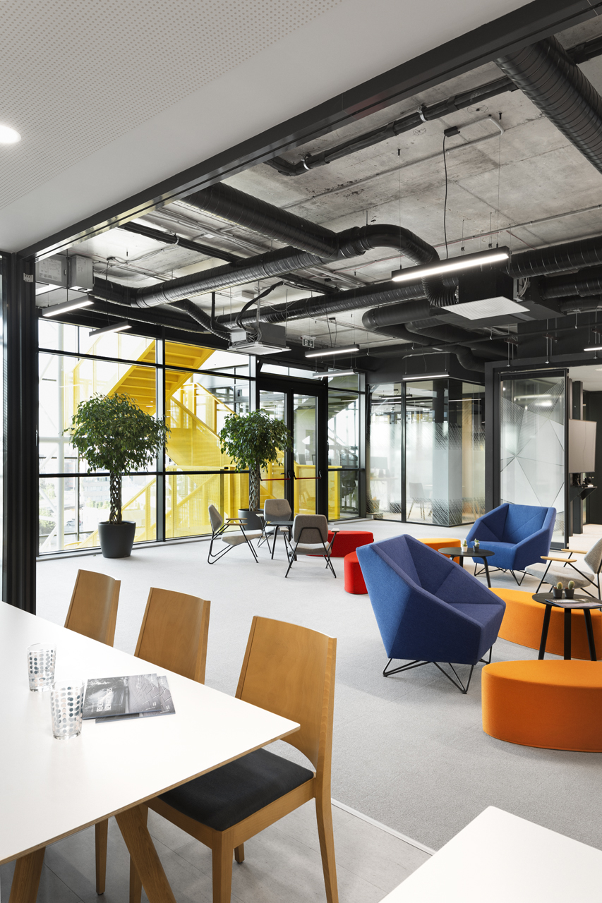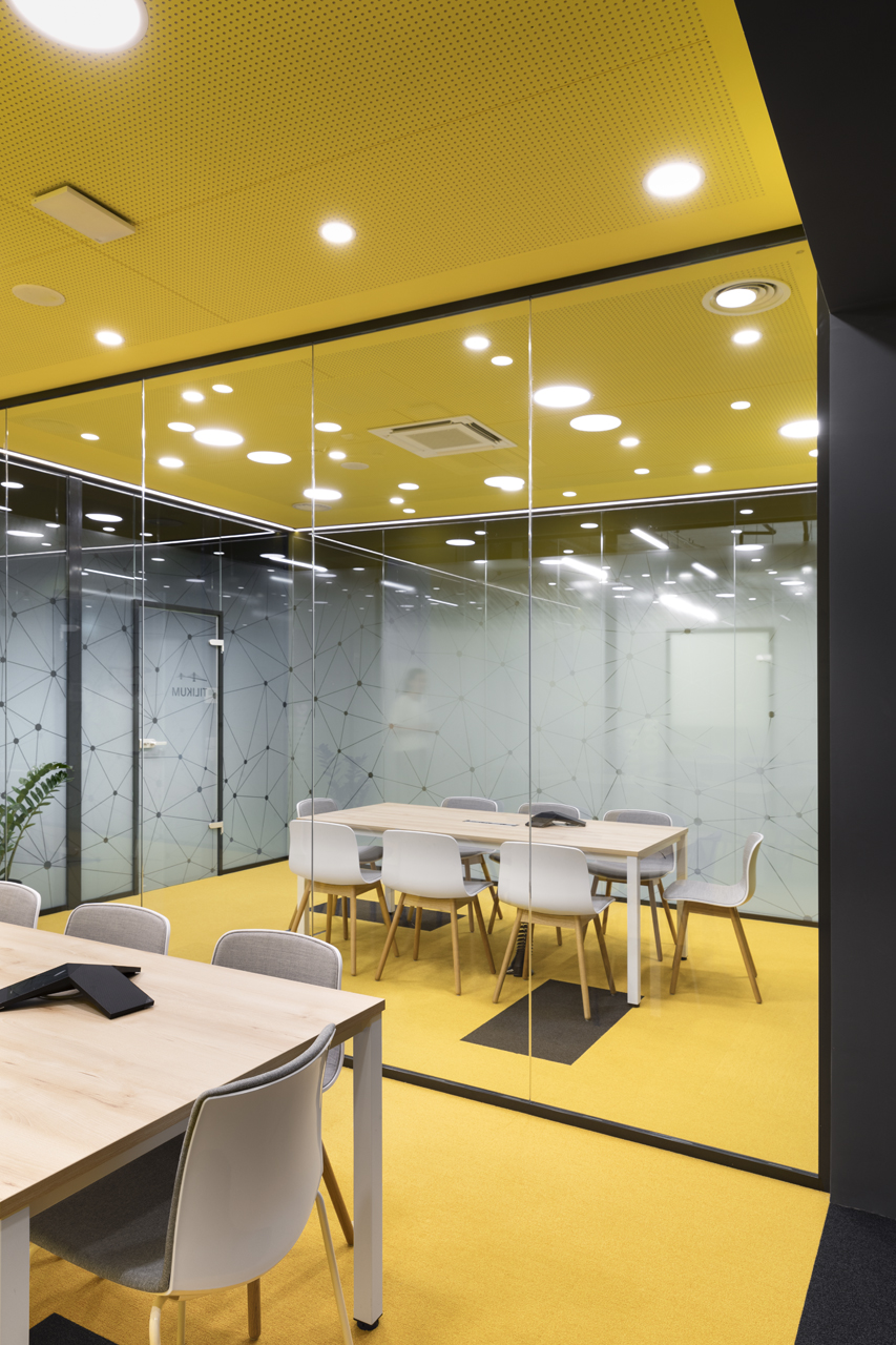 The coffee corners and small kitchen areas are spread throughout the office, as well as the more private meeting rooms. The graphic design is also done by SKICA. It uses the corporate colours and serves also as a delicate visual barrier between the different spaces – at times completely transparent or frosted to offer privacy, but always keeping the views to the Mountain and the city open.