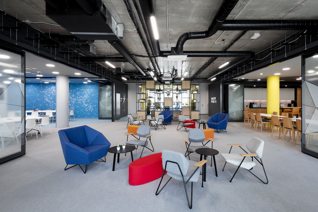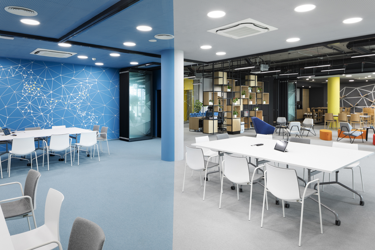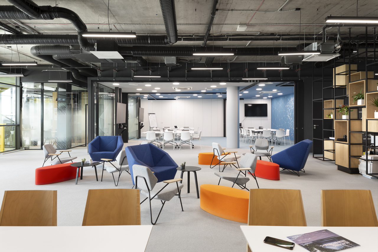 Milestone Systems Bulgaria was looking for a new home for their growing team of talented developers and SKICA was chosen to design the interior of their offices in the south of Sofia. The requirement was to have a large public zone with a café and conference centre; open-space working areas; flexible conference rooms; and technical and storage area with restricted access.